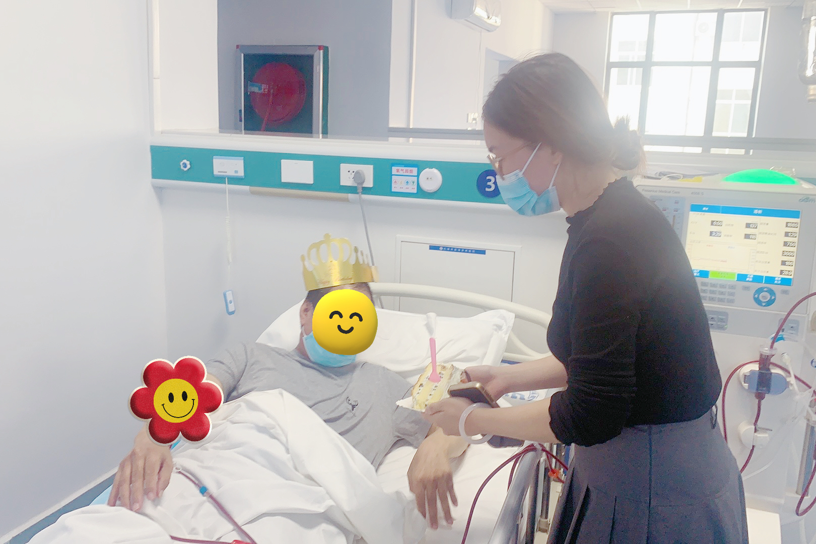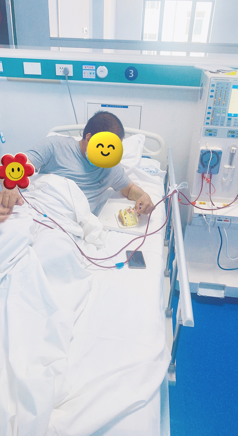 生日蛋糕下午送到了,我們的醫(yī)護人員用推車把蛋糕送到血透室,醫(yī)護人員給吳大哥戴上了壽星帽,并點燃生日蛋糕的蠟燭,吳大哥既驚喜又開心,他的心情很激動,沒想到自己都忘記了生日的時間,而我們的醫(yī)護人員卻記得,還給他準備生日蛋糕慶祝生日。我們的醫(yī)護人員圍一起給他唱響生日快樂歌,祝福他生日快樂,身體健康,現場很溫馨,隔壁病床的腎友也給吳大哥送上生日祝福。隨后吳大哥在大家的美好祝福聲中閉上眼睛許愿并吹滅蠟燭,現場響起輕快的掌聲,我們希望他能夠夢想成真。